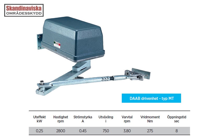 Öppningshastighet: 8 sekunderHuvudström: 230 V (omvandlas till 400V för motorerna)Överklättringsskydd: Hajfena kan fås som tillval.