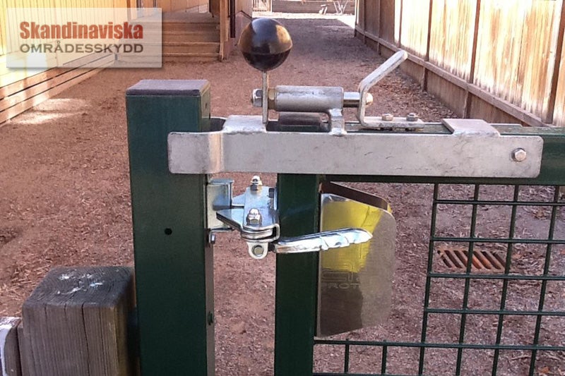 Skjuthållarlås för enkelgrind som monteras på grindens ovansida.