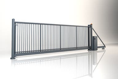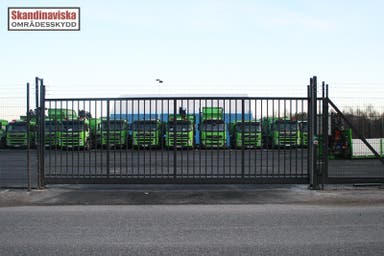 Fribärande automatisk skjutgrind. Standardhöjd: 1950 + 300 mm (taggtråd), Öppningsmått: 4000 - 6500 mm